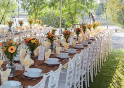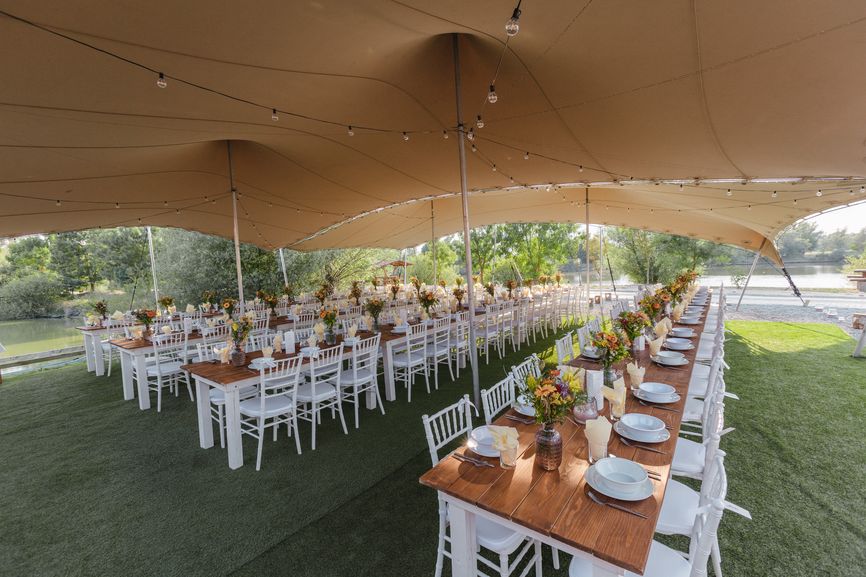 A Széchényi Robinson szigeteken egy igazán különleges esküvőre készültünk: két sátor, összesen 168 m² fedett terület, gyönyörű padozattal és berendezéssel együtt biztosította a tökéletes hátteret az ifjú pár nagy napjához.